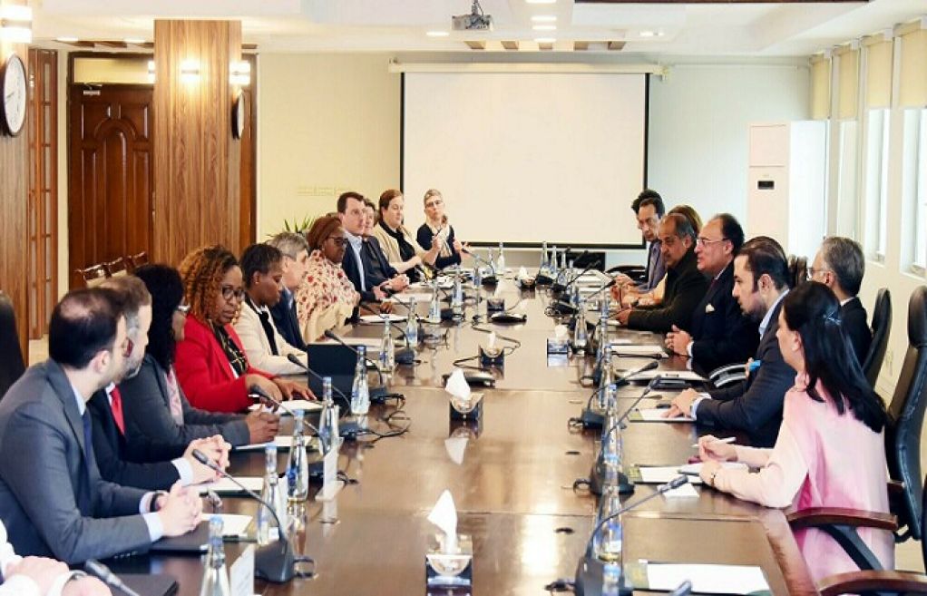 وفاقی وزیر برائے خزانہ و محصولات سینیٹر محمد اورنگزیب اور عالمی بینک کے ایک اعلیٰ سطحی وفد کے درمیان آج وزارتِ خزانہ میں ملاقات ہوئی، عالمی بنک کے وفد کی قیادت بنک کی منیجنگ ڈائریکٹر آپریشنز اینا بیئرڈے کر رہی تھیں۔