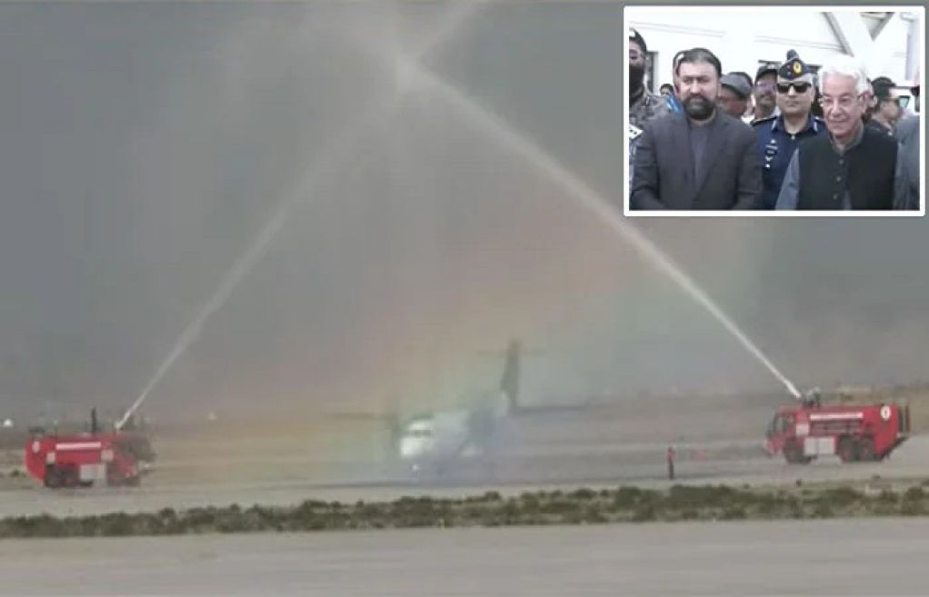 کراچی سے گئی پہلی پرواز کو نیو گوادر ایئر پورٹ پر اترنے پر واٹر سلیوٹ دیا گیا۔ اس موقع پر ایک رنگا رنگ تقریب بھی منعقد ہوئی۔