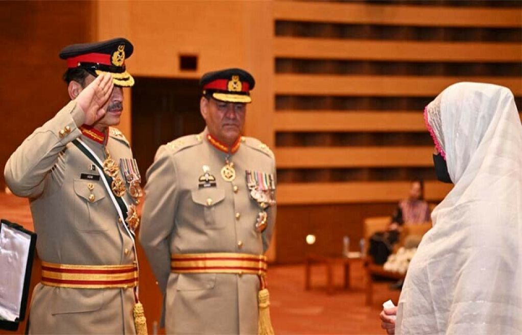 آرمی چیف جنرل عاصم منیر نے کہا ہے کہ کہ شہدا اور غازی قوم کا فخر ہیں، جن کا احترام ہر پاکستانی کے لیے مقدس ہے، آج کا امن اور آزادی شہدا کی قربانیوں کے مرہون منت ہے۔ انٹرسروسز پبلک ریلیشن (آئی ایس پی آر) کے مطابق آرمی چیف جنرل عاصم منیر نے جی ایچ کیو میں افسران اور جوانوں کو فوجی اعزازات سے نوازا ہے، شہدا کے اعزازات ان کے اہل خانہ نے وصول کیے۔