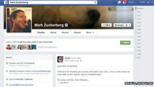 ایک فلسطینی ہیکر نے فیس بک کے بانی مارک زکربرگ کے ذاتی صفحے پر پیغام لکھ کر فیس بک کے سکیورٹی سسٹم میں خامی کی نشاندہی کی ہے۔