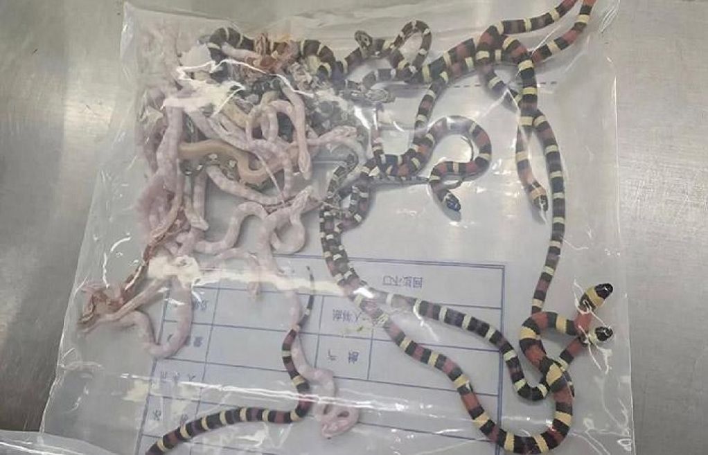 کسٹم حکام نے مسافر کی جیبوں سے وہ بیگ نکالے تو ہر بیگ میں مختلف سائز اور اقسام کے درجنوں زندہ سانپ پائے گئے۔